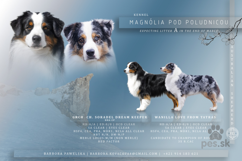 (09.03.2026)Chovná stanica Magnolia pod Poludnicou (Liptovský Mikuláš) očakáva šteniatka austrálskeho ovčiaka s PP koncom marca 2026. Rezervácie otvorené. Zdravotné výsledky rodičov viď leták. Šteniatka majú po oboch rodičoch predpoklad pre super priateľskú a vyrovnanú povahu. Vhodné na šport, výcvik aj ako rodinný spoločník.