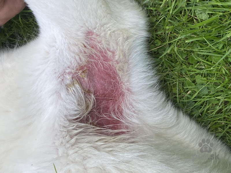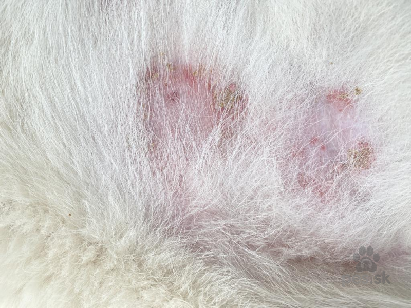 Objavujú sa mu červené škvrny na koži a vypadáva srsť keď srsť potiahnem okolo miesta tak mi ostane chumáč srsti v ruke a na konci ma také ako biele šupinky ale srsť zarasta naspäť na tých miestach