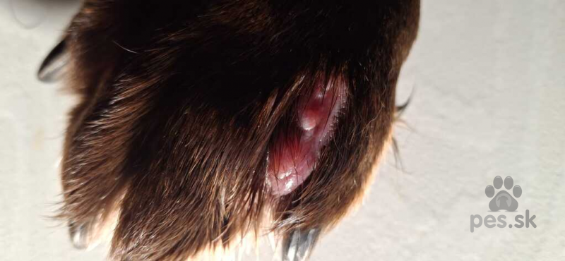 rada by som sa spýtala aj vás na nestranný názor ohľadom problému, ktorý má naša sučka (Labrador, 9 rokov). Už dlhšie sa jej medzi prstami na predných labkách robia hrčky. Posledné dni sa jej to miestami zrazu dosť zväčšilo, začervenalo a pes si to často olizuje (prikladám fotku).